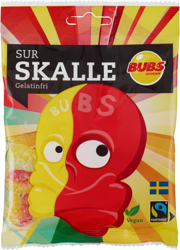 Det finns Surskallar och så finns det STORA Surskallar. Av naturliga skäl är de rejält sura och stora på samma gång. Stora Surskallar är ett perfekt val för dig som är allmänt vresig och envis. ”A match made in heaven”, som de säger. Innehållet är helt fritt från gelatin och andra animaliska tillsatser.